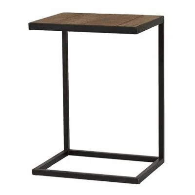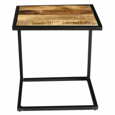 La table d’appoint est fabriquée en métal et possède un dessus en bois de mangolia tropical.