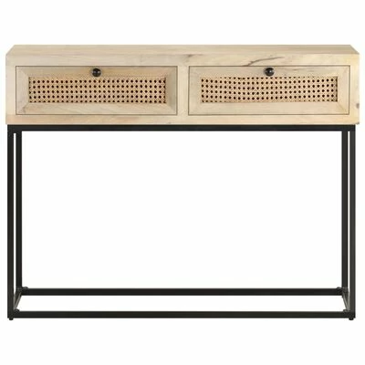 Le bois de manguier massif est un bois dur tropical. Il a d’une part la force de soutenir le poids, et d’autre part résiste à l’usure du temps. De plus, le savoir-faire exquis et les beaux grains de bois rendent chaque pièce de tables d’appoint légèrement différente l’une de l’autre. La table de couloir est équipée d’un grand espace de rangement, donc vous pouvez afficher ou garder bien organisés tous les articles que vous souhaitez. La base en acier contribue à sa robustesse et à sa stabilité. De plus, la table sous miroir présente un motif de canne tissé à la main sur les tiroirs, ce qui ajoute à son charme rustique.