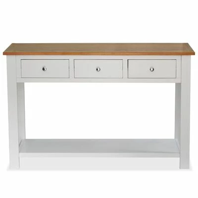 La table a un dessus en chêne massif, ce qui s’ajoute à sa robustesse et à sa durabilité. Le bois de chêne a de beaux grains de bois qui donnent un charme naturel au meuble. Le cadre, en pin massif avec une finition blanche, lui confère son style contemporain. Cette table console s’accordera à presque tous les styles d’intérieurs grâce à son aspect élégant.