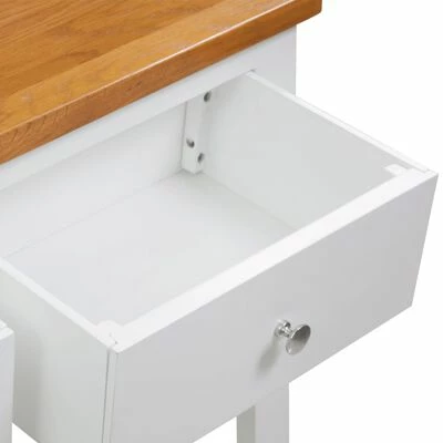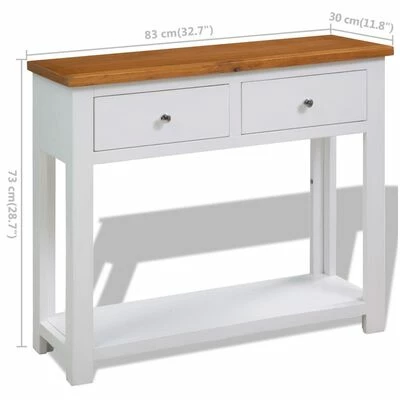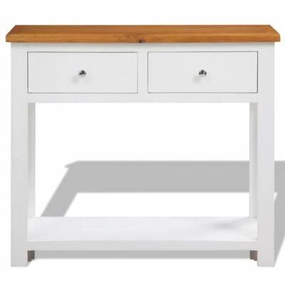 Cette table a été spécialement conçue à partir de chêne massif durable et de bois d’acacia. Les bords propres et les boutons métalliques polis ajoutent à son style champêtre moderne. Grâce à sa conception compacte, notre table console prend très peu d’espace et peut également être placée dans des pièces plus petites. Le dessus rectangulaire est idéal pour placer un téléphone ou afficher des objets décoratifs tels que des cadres photo ou des plantes en pot. Les deux tiroirs vous offrent un espace suffisant pour stocker vos bibelots, cosmétiques et autres objets de petite taille. L’étagère en dessous fournit un espace de rangement supplémentaire.