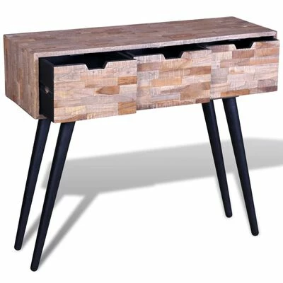 Cette table console en bois de teck recyclé est un accessoire intemporel dans votre maison. Son dessus de table en bois massif offre amplement d’espace pour exposer des objets décoratifs, des cadres photo ou même des plantes en pot, tandis que vous pouvez garder de petits objets comme des clés, des blocs-notes, des stylos et d’autres bibelots dans ses trois grands tiroirs. Elle peut être utilisée aussi comme armoire console, buffet, armoire haute, tables d’appoint, etc.