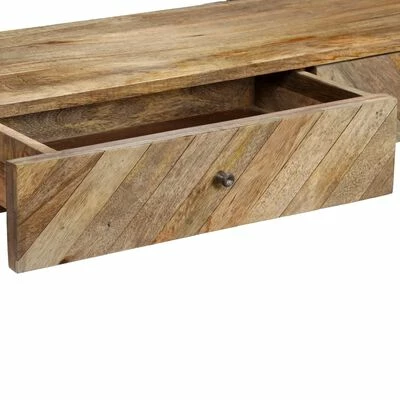 La table d’appoint est en bois de manguier massif, poli, peint et laqué, mais a conservé sa couleur naturelle et son aspect brut. Cette table est entièrement faite à la main et les magnifiques grains de bois rendent chaque meuble unique et légèrement différent l’un de l’autre. Cette table d’appoint a une surface solide et stable, sur laquelle vous pouvez placer des paniers de fruits, des vases ou d’autres objets décoratifs. Cette table console a deux tiroirs et une étagère, qui offrent suffisamment d’espace pour garder vos magazines, livres et autres petits objets à portée de main. L’assemblage est facile.