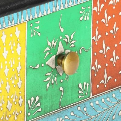 La table est faite à la main en bois de manguier et MDF qui est à la fois durable et beau et l’artisanat s’ajoute à son spectaculaire style rétro. La table présente de riches détails décoratifs peints à la main qui exhalent une touche d’élégance et soulignent l’aspect raffiné. Les boutons distinctifs facilitent l’ouverture des tiroirs et rehaussent le style de la table.