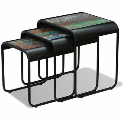Cet ensemble de style vintage de 3 tables gigognes, en bois de récupération massif, sera un accessoire intemporel à votre maison. Ces tables peuvent être utilisées comme tables basses, bouts de canapé, tables de salon, tables de chevet, tables d’appoint, supports de téléphone, etc. Grâce au solide cadre en acier, les tables sont très stables et durables. Étant empilables, ces tables conservent beaucoup d’espace lorsqu’elles ne sont pas utilisées.